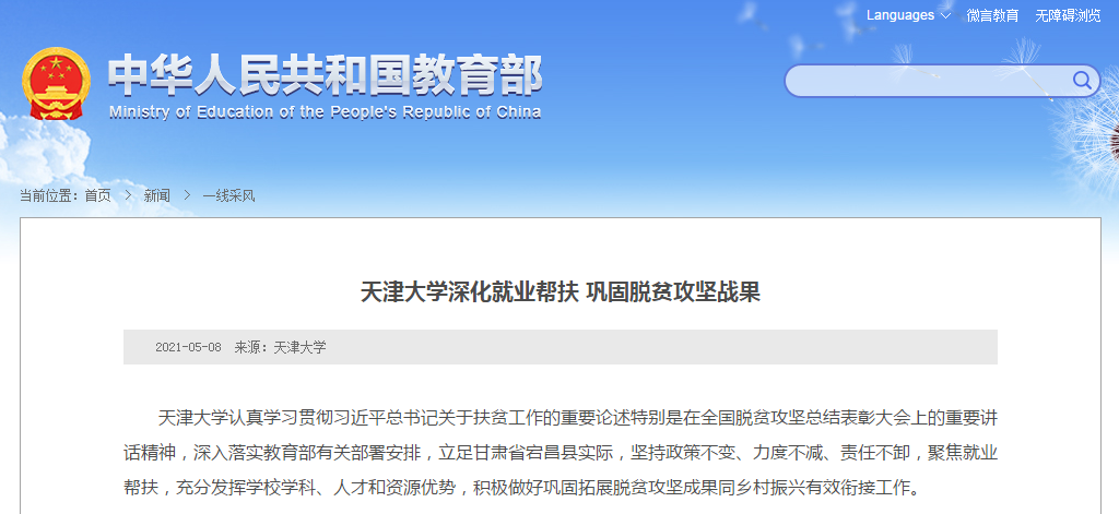 天津大学认真学习贯彻习近平总书记关于扶贫工作的重要论述特别是在全国脱贫攻坚总结表彰大会上的重要讲话精神,深入落实教育部有关部署安排,立足甘肃省宕昌县实际,坚持政策不变、力度不减、责任不卸,聚焦就业帮扶,充分发挥学校学科、人才和资源优势,积极做好巩固拓展脱贫攻坚成果同乡村振兴有效衔接工作。