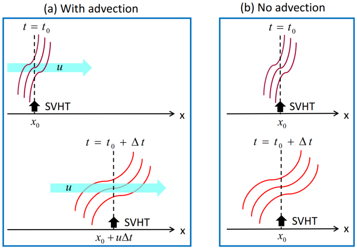 图2(a)有(b)无平流作用(advection)的情况下锋面倒塌时次中尺度垂向热输运(SVHT)的生成位置(a)发生(b)不发生变化的示意图。